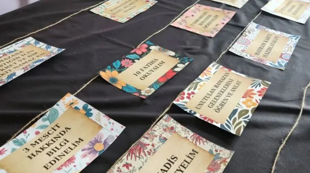 Öğrencilerin askıdan çektikleri kartlarda yer alan “10 Fatiha okuyalım”, “Teravih namazına gidelim” gibi ifadelerin yerine getirilmesinin istendiği görüldü.