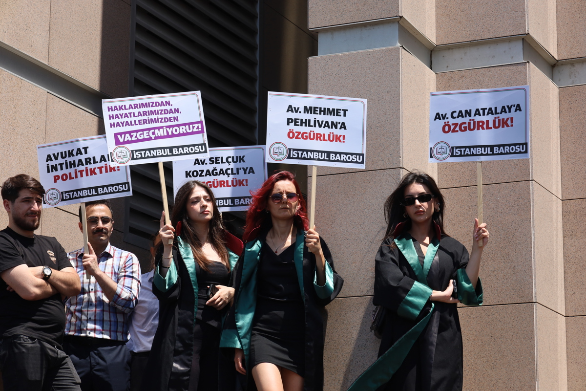 MA’nın haberine göre, açıklama öncesi adliye çevresi polis ablukasına alındı. Avukatlar, “Av. Mehmet Pehlivan’a özgürlük”, “Avukat. Selçuk Kozağaçlı’ya özgürlük”, “Demokratik irademize sahip çıkıyoruz” yazılı dövizler ve siyah balonlarla tepkilerini dile getirdi.