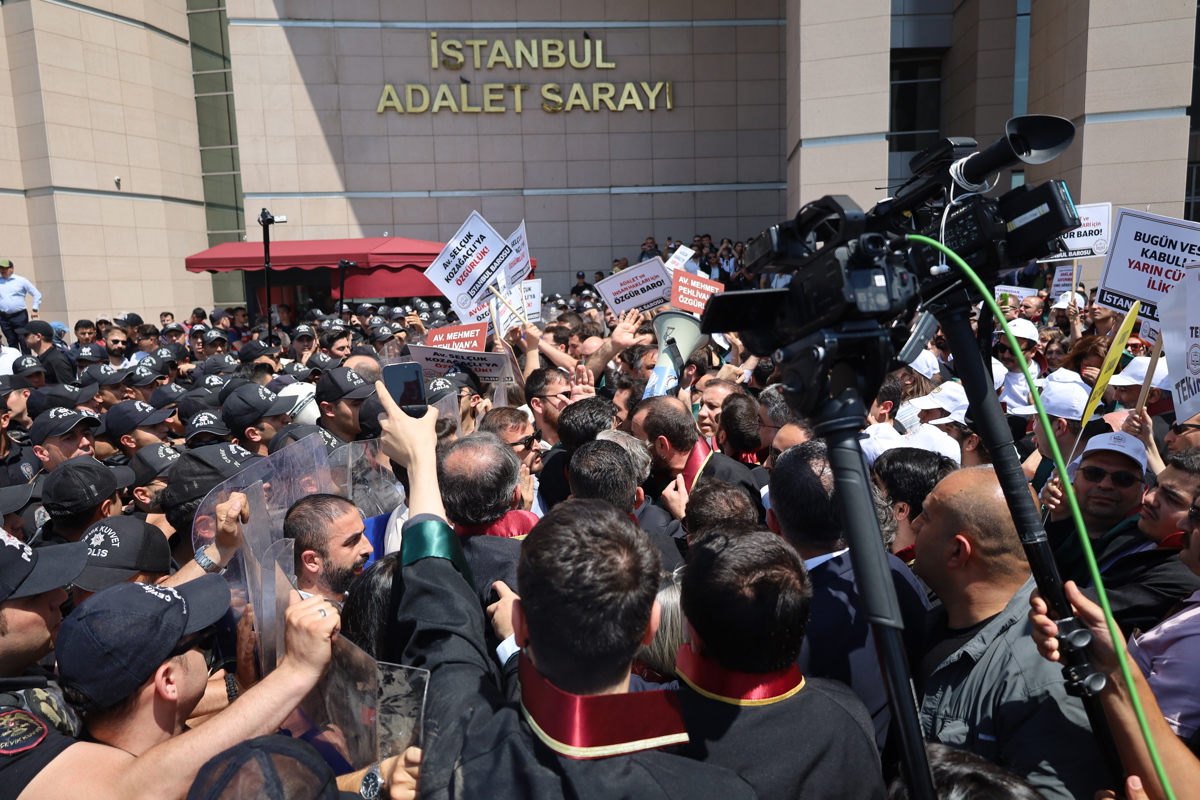 Açıklamanın ardından İstanbul Barosu’na yürümek isteyen avukatlar polis barikatıyla karşılaştı. “Savunmaya değil, çetelere barikat” sloganlarıyla tepki gösteren avukatlar, bir süre barikata yüklenerek protestolarını sürdürdü. Bazı avukatlar adliye içine girerek oturma eylemi başlatırken, diğerleri dışarıda beklemeye devam etti.