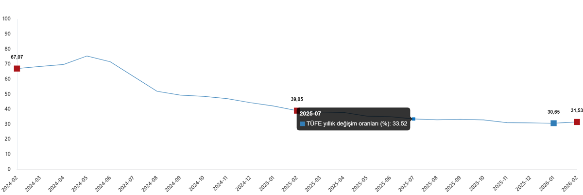 12 aylık ortalamaya göre belirlenen kira artış oranı şubat itibarıyla yüzde 33,39 oldu. Aynı ayda tüketici enflasyonu aylık yüzde 2,96, yıllık yüzde 31,53 olarak açıklandı.