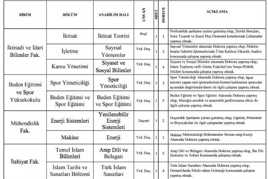 “İlahiyat Fakültesine alınacak iki Yrd. Doç için şu kriterler aranıyor: ‘Arap Dili ve Belagatı Alanında Doktora yapmış olup, İbn Ebi Zemenin ve Tefsiri Konusunda çalışmış olmak. Türk İslam Sanatları Alanında Doktora yapmış olup, Osmanlılarda Silsile-nâme Geleneği konusunda çalışma yapmış olmak.’ Mühendislik Fakültesine bir adet Doçent alımı için de şu kriterler aranıyor: Doçentlik Şartlarını yerine getirmiş olup, ‘Lipitler, Proteinler ve Biyoyakıtlar ile ilgili çalışmalar yapmış olmak’.”