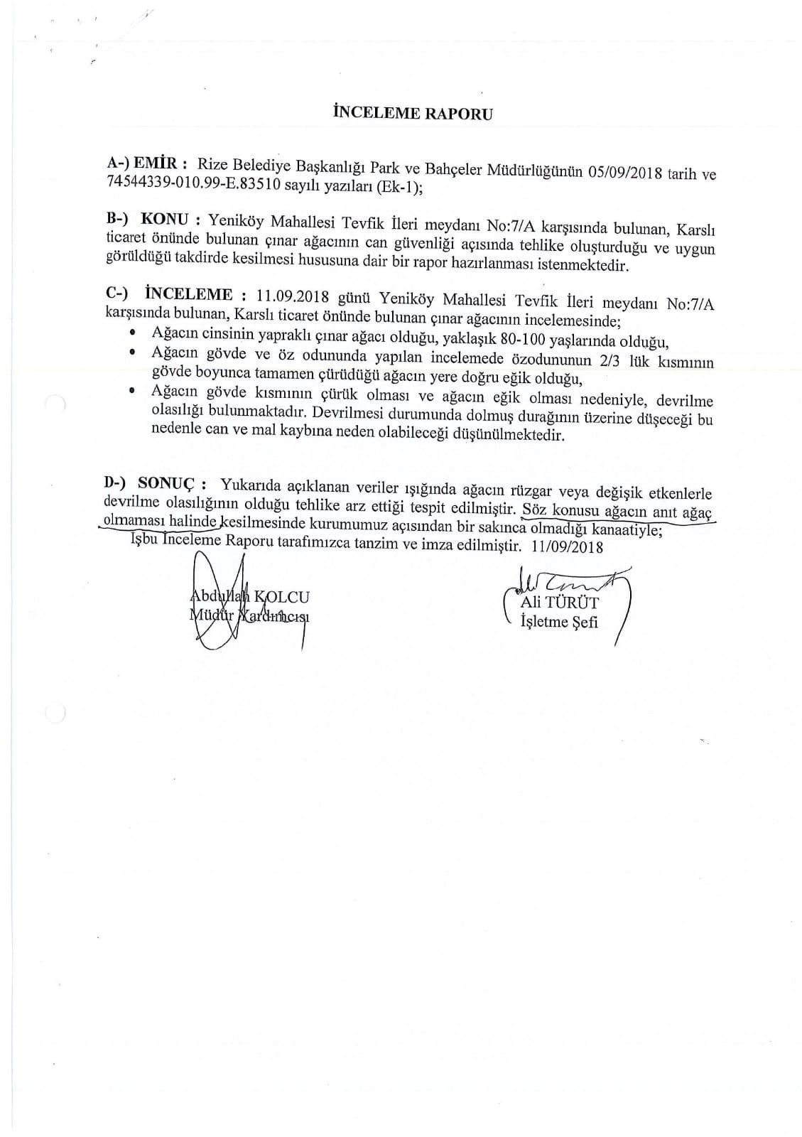 Kasap açıklamasında ağacın çürüdüğüne dair rapor olduğunu belirtti. Belediyenin sitesinden Rize Orman İşletme Müdürlüğü Kadastro ve Mülkiyet Şefliği’nden alınan rapor yayınlandı.