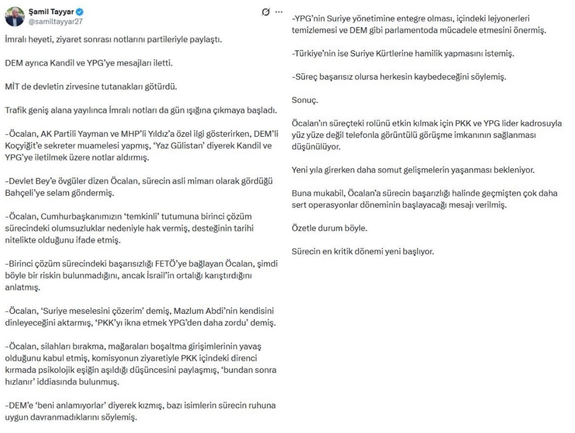 Eski AKP milletvekili Şamil Tayyar, akşam saatlerinde sosyal medya hesabından pazartesi günü İmralı'ya giden "Milli Dayanışma, Kardeşlik ve Demokrasi Komisyonu"nun görevlendirdiği heyet üyelerinin ziyaret sonrası Öcalan'la görüşme "notlarını" partilerine ulaştırdıklarını, DEM Parti'nin ayrıca Kandil ve YPG'ye de "mesajları iletti[ğini]", MİT'in de "devletin zirvesine tutanakları götürdü[ğünü]" duyurdu.