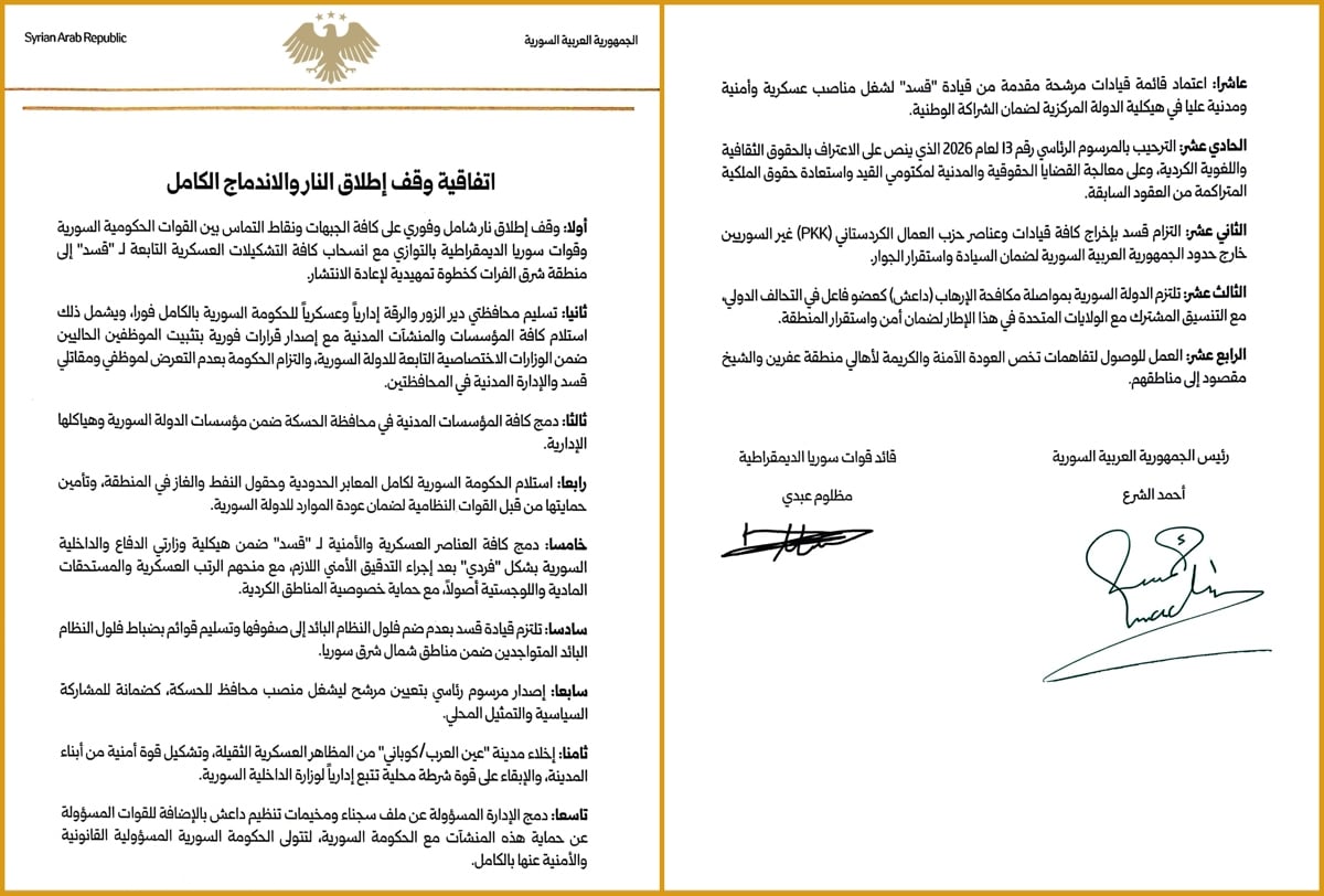 Anlaşma, Suriye Geçiş Dönemi Cumhurbaşkanı Ahmed eş-Şara ile SDG Genel Komutanı Mazlum Abdi arasında imzalandı.