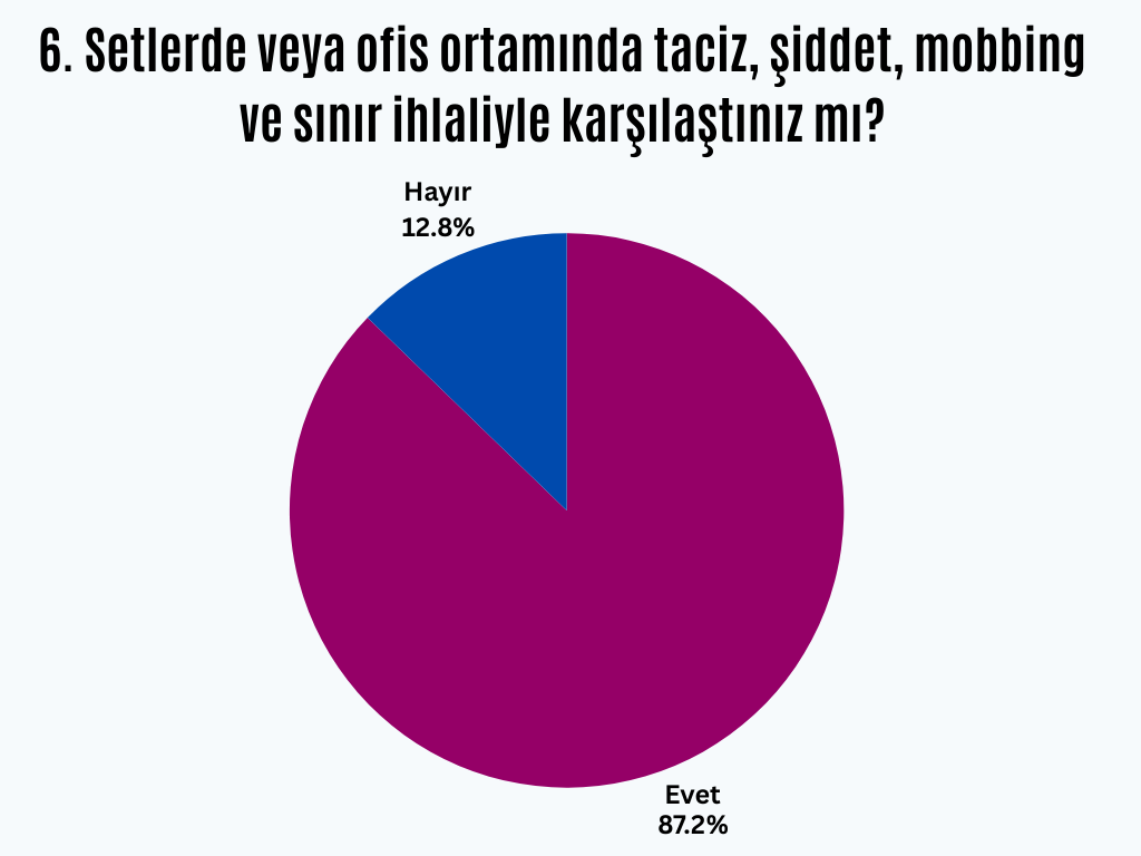 Rapor, cinsiyet temelli ihlallerin mesleki kıdemle azalmadığını da ortaya koyuyor. Katılımcıların yüzde 44,9’u sinema sektöründe 10 yıl ve üzeri deneyime sahip olmasına rağmen, hak ihlallerinin devam etmesi, sorunun sektörel bir kültürle ilişkili olduğunu gösteriyor.