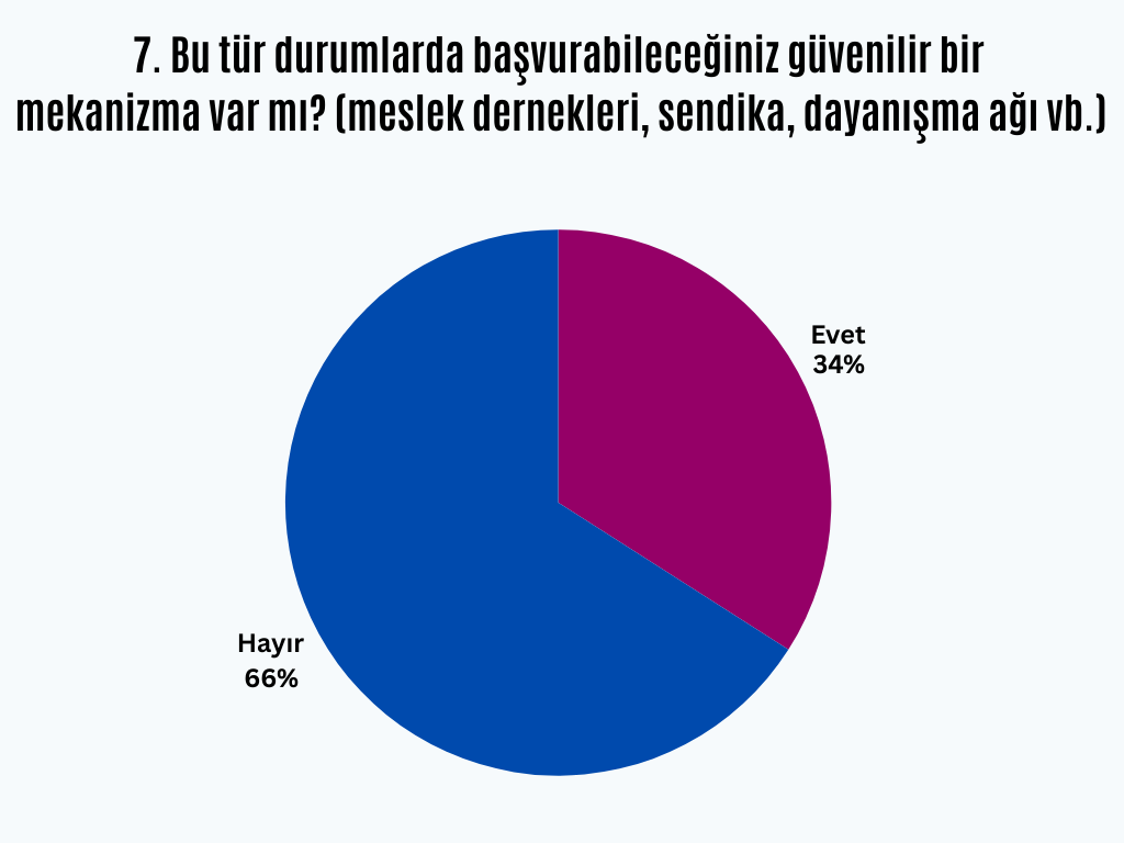 Araştırmanın çarpıcı bulgularından biri ise kadınların, maruz kaldıkları ihlaller karşısında başvurabilecekleri mekanizmaların yokluğu. Katılımcıların yüzde 66’sı, kendilerini koruyacak bir dayanışma ağına ya da hukuki başvuru yoluna erişemediğini söylüyor.