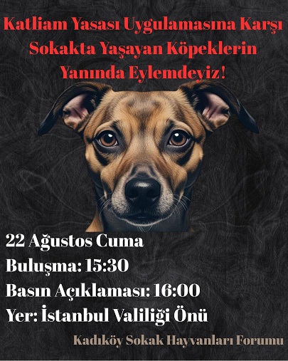 “Katliam Yasası uygulamasına karşı sokakta yaşayan köpeklerin yanında eylemdeyiz!” ifadelerinin yer aldığı hak savunucularının çağrısına göre, saat 16.00’da da bir basın açıklaması gerçekleştirilecek. (TY)