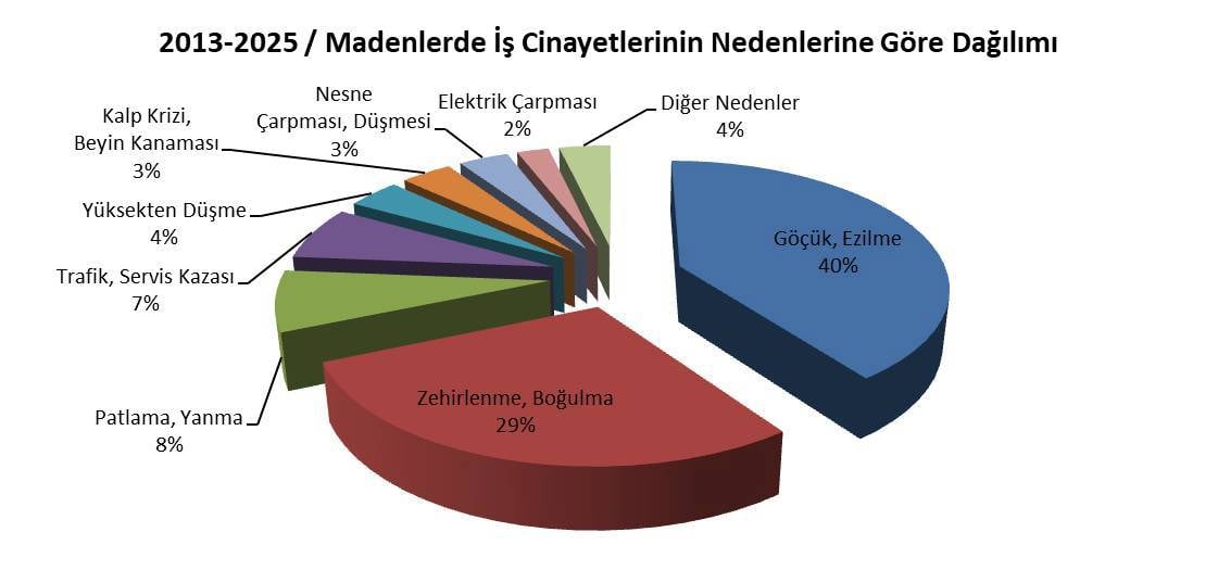 Rapora göre ölüm nedenleri içinde ilk sırayı göçük/ezilme alıyor: 507 işçi. İkinci sırada zehirlenme/boğulma var: 363 işçi. Diğer başlıklar ise şöyle: