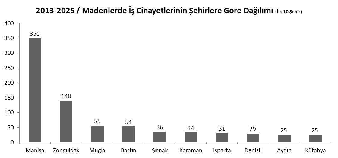 İllere göre dağılımda ilk iki sırada kömür üretiminin yoğunlaştığı merkezler var. Manisa 350 ölüm, Zonguldak 140 ölüm.