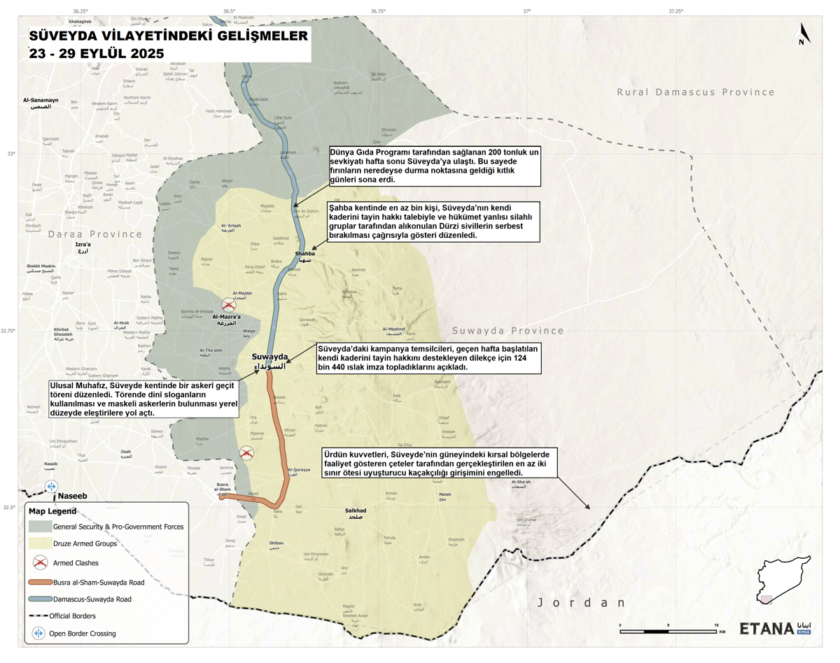 Londra merkezli, muhalif Suriye İnsan Hakları Gözlemevi’nin (SOHR) aktardığına göre, bu hafta içinde sivil bir otobüse yönelik silahlı saldırı, dronlarla gerçekleştirilen bombalamalar ve temas hatları boyunca karşılıklı sızma girişimleri yaşandı. Çatışmalar, Dürzi silahlı gruplar ile Savunma Bakanlığı güçleri ve onların desteklediği Bedevi silahlı unsurlar arasında meydana geldi.