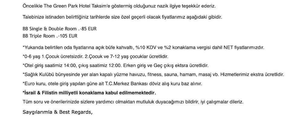 "The Green Park Hotel Taksim tarafından müşterilere iletilen ve derneğimize ulaştırılan yazılı yanıtta, İsrail ve Filistin milliyetine sahip kişilerin konaklamasının kabul edilmediği ifade edilmektedir. Bu uygulama, milliyete dayalı açık bir ayrımcılık niteliği taşımakta ve aynı zamanda bireylerin seyahat özgürlüğü ve hizmetlere eşit erişim hakkını ihlal etmektedir."