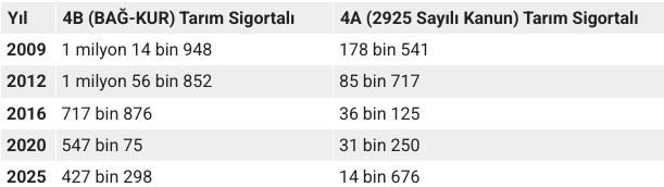 Tarımda ücretli olarak mevsimlik veya sürekli çalışanları kapsayan Tarım 4A (2925 sayılı Tarım İşçileri Sosyal Sigortalar Kanunu kapsamında) sigortalı sayısının da düştüğünü belirten Gürer, “2009’da 178 bin 541 kişi olan Tarım 4A sigortalısı, 2024’te sadece 14 bin 676 kişiye indi. Bu azalış yüzde 91’i buldu. Prim yükü ağır, destek yok, kayıt dışı çalışma yaygın. Tarımda çalışan on binlerce emekçi, güvencesizliğe mahkûm bırakıldı” ifadelerini kullandı.