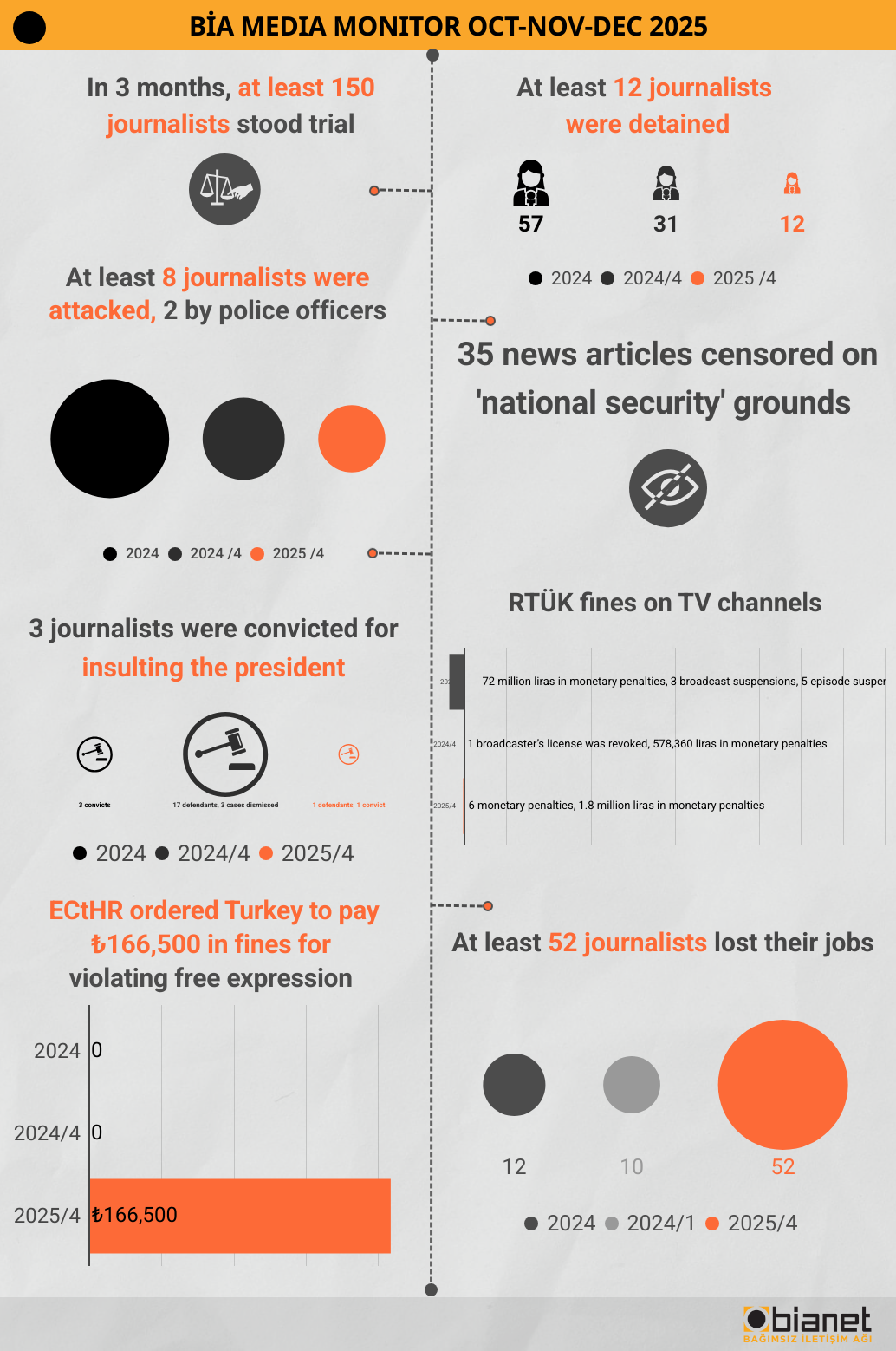 The BİA Media Monitoring Report covering the period from October to December 2025 reveals that government authorities continued their interference with the judiciary, as seen in the cases of LeMan magazine, Fatih Altaylı, Merdan Yanardağ, and Enver Aysever. This pattern persisted with the arbitrary detention of respected figures such as Ruşen Çakır and Barış Terkoğlu. The report also shows that, despite a change in leadership, the Radio and Television Supreme Council (RTÜK) has continued imposing monetary fines aimed at weakening critical broadcasters.