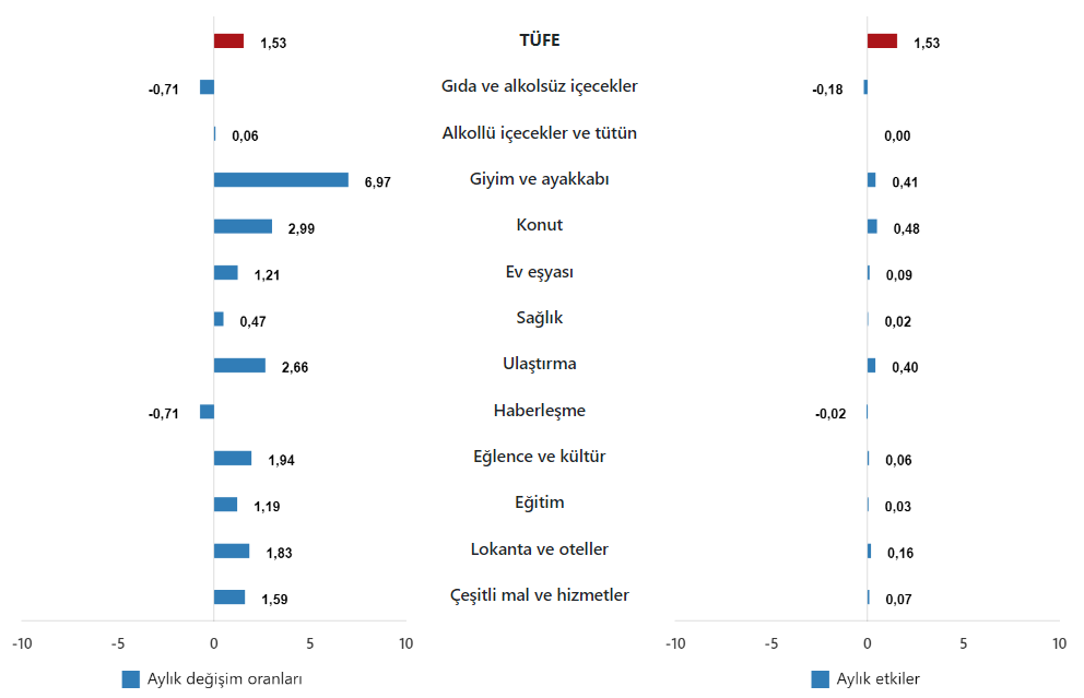 İlgili ana grupların aylık değişime olan etkileri ise gıda ve alkolsüz içeceklerde yüzde -0,18, ulaştırmada yüzde 0,40 ve konutta yüzde 0,48 oldu.