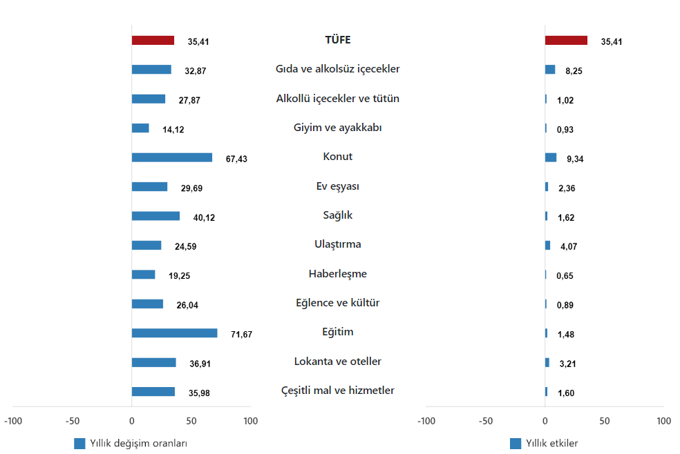 En yüksek ağırlığa sahip 3 ana harcama grubunun yıllık değişimleri; gıda ve alkolsüz içeceklerde yüzde 32,87 artış, ulaştırmada yüzde 24,59 artış ve konutta yüzde 67,43 artış olarak gerçekleşti.