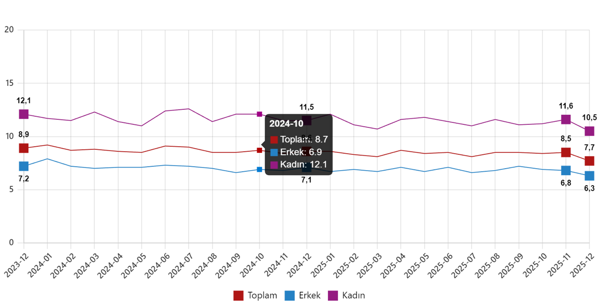 Buna göre Türkiye genelinde 15 ve daha yukarı yaş grubundaki işsiz sayısı, Aralık 2025'te bir önceki aya kıyasla 286 bin azalışla 2 milyon 736 bin kişi olarak belirlendi. İşsizlik oranı, 0,8 puan azalışla yüzde 7,7 oldu. İşsizlik oranı erkeklerde yüzde 6,3, kadınlarda yüzde 10,5 olarak kayıtlara geçti.