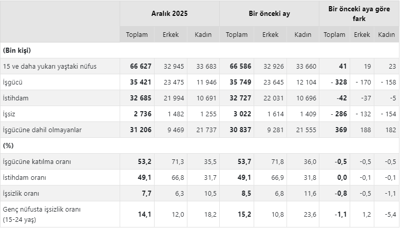 Türkiye İstatistik Kurumu (TÜİK), Aralık 2025 dönemine ilişkin iş gücü istatistiklerini açıkladı.