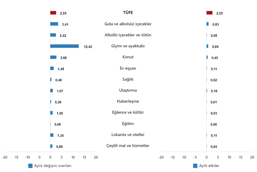 İlgili ana grupların aylık değişime olan etkileri ise gıda ve alkolsüz içeceklerde yüzde 0,83, ulaştırmada yüzde 0,16 ve konutta yüzde 0,45 oldu.