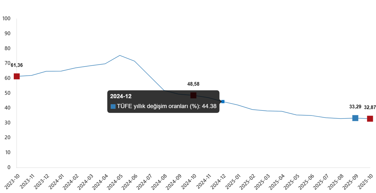 Enflasyon ekimde aylık bazda yüzde 2,55, yıllık bazda yüzde 32,87 oldu. Türkiye İstatistik Kurumu’nun (TÜİK) açıkladığı verilere göre fiyatlar aralıktan bugüne de yüzde 28,63 artış gösterdi.