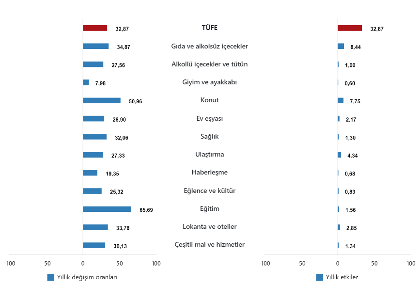 En yüksek ağırlığa sahip 3 ana harcama grubunun yıllık değişimleri; gıda ve alkolsüz içeceklerde yüzde 34,87 artış, ulaştırmada yüzde 27,33 artış ve konutta yüzde 50,96 artış olarak gerçekleşti.