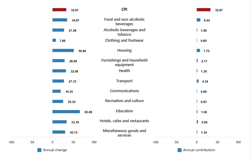 Among the main spending categories, housing recorded the highest annual increase at 50.96%, followed by food and non-alcoholic beverages at 34.87%, and transportation at 27.33%. Their respective contributions to overall inflation were 7.75%, 8.44%, and 4.34%.