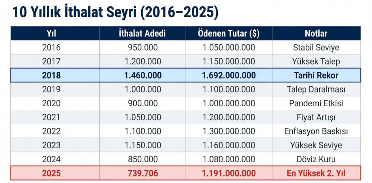 Türkiye’nin 2016–2025 dönemindeki canlı sığır ithalat verilerini değerlendiren Gürer, “2018’deki 1 milyar 692 milyon dolarlık rekorun ardından, en yüksek döviz çıkışın 1 milyar 191 milyon dolar ile 2025’te yaşandı. 2023’teki 1 milyar 163 milyon dolarlık ve 2017’deki 1 milyar 159 milyon dolarlık rakamları geride bıraktı. Bu tablo, ithalatın geçici bir pansuman değil, ne yazık ki kalıcı ve maliyetli bir bağımlılık haline geldiğini gösteriyor” diye konuştu.