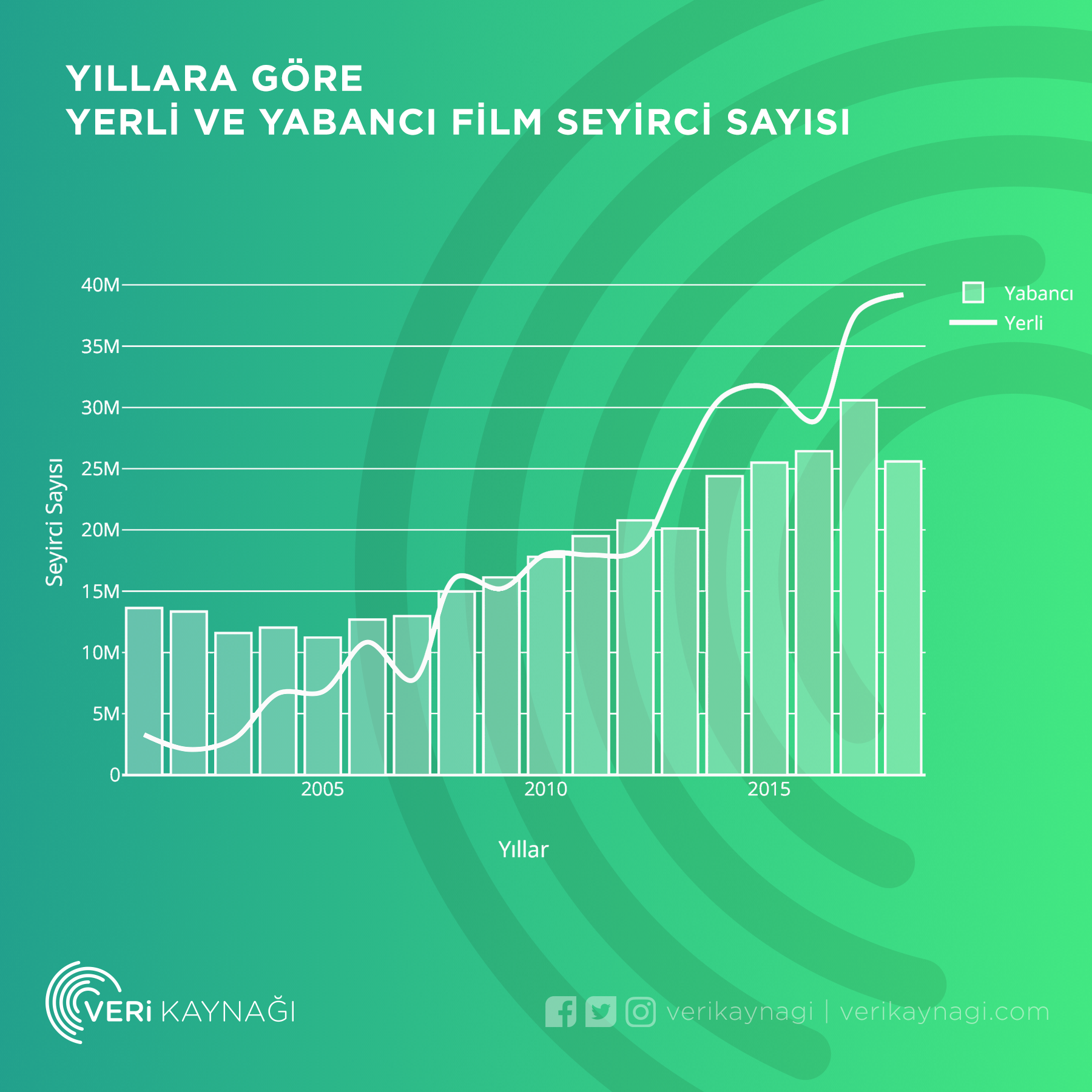 2001’den 2009’a kadar yabancı filmlerdeki seyirci sayısı yerli filmlerdekinin üzerinde seyretti. Ancak 2010’da ikisi arasında neredeyse eşitlenen sayı, yerli filmlerdeki seyircinin artmasıyla tersine döndü.