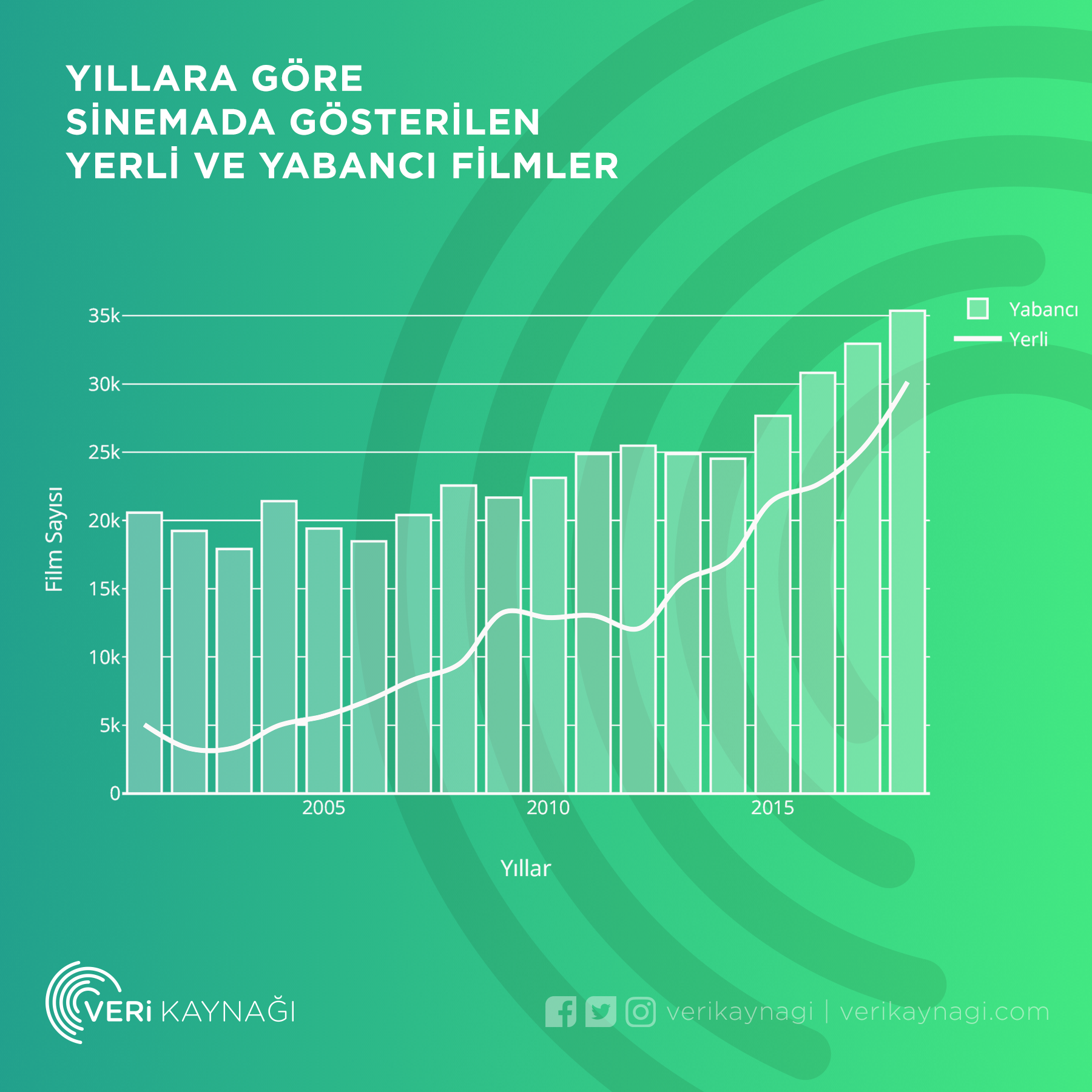 Veri Kaynağı’na göre, 2001’den 2018’e kadar Türkiye’de gösterilen yerli ve yabancı filmlerin sayısında ciddi bir artış oldu.