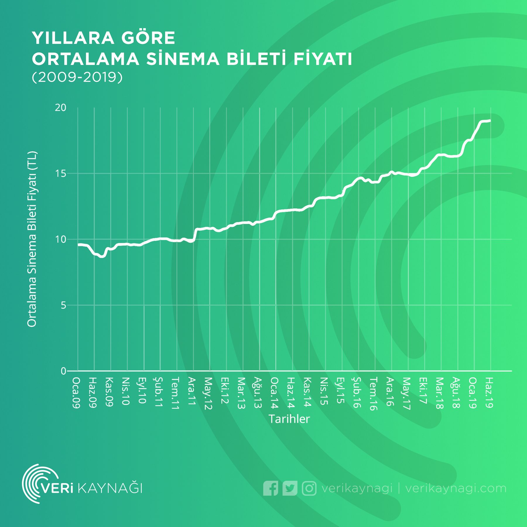 2019 yılının haziran ayında ortalama sinema bileti fiyatı, 10 yılda yaklaşık iki katına çıkarak 19,02 liraya yükseldi.