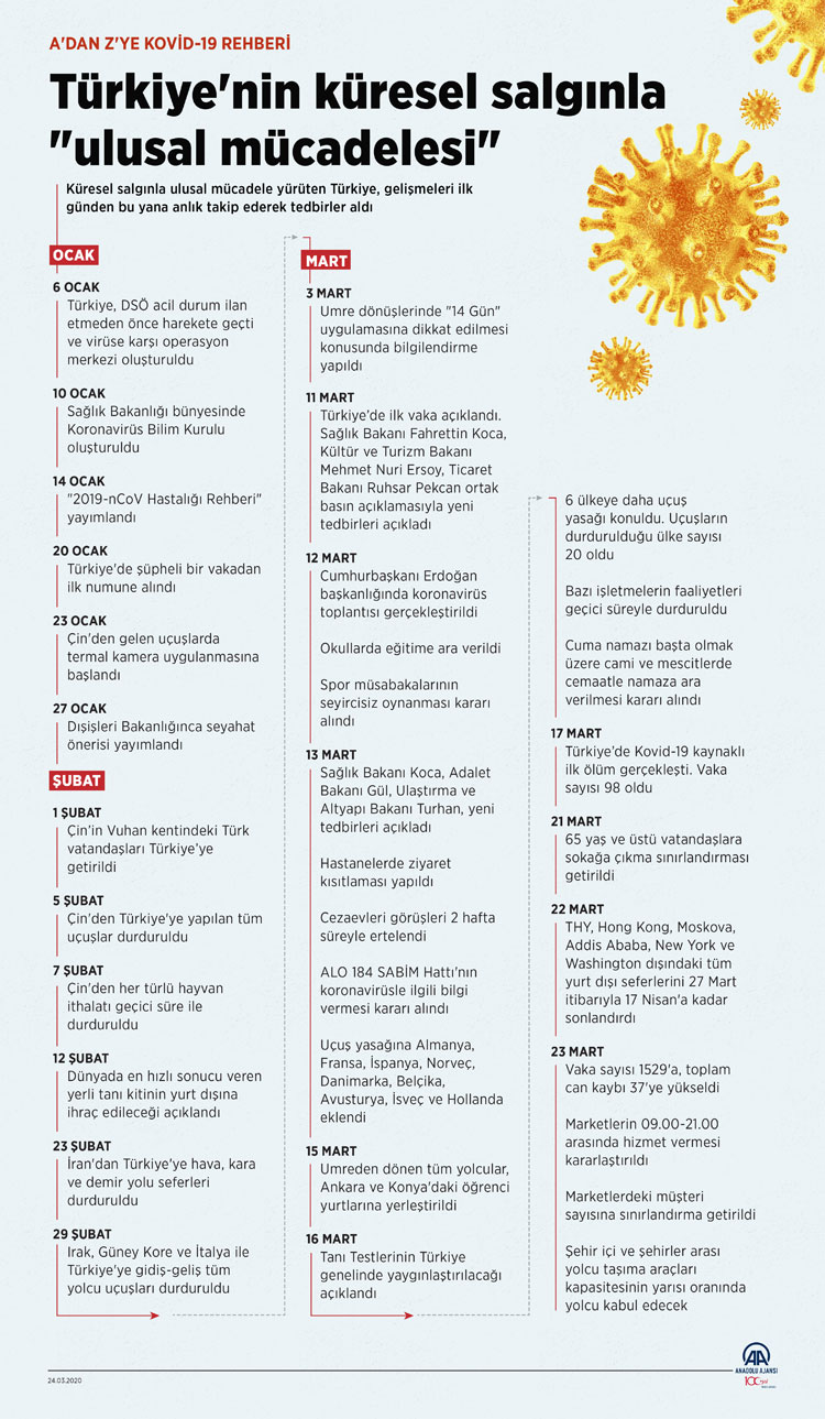 Türkiye’nin, Aralık 2019’da Çin'in Wuhan kentinde ortaya çıkan yeni tip koronavirüsle (covid-19) ilgili yürüttüğü ulusal mücadele sürecini gün gün derledik.