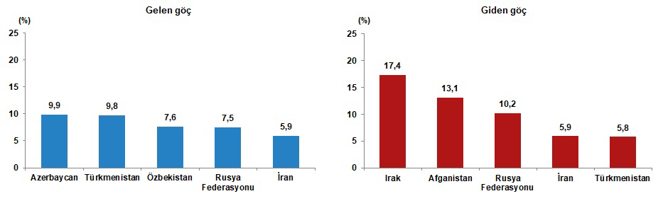 Türkiye'den göç eden yabancı uyruklu nüfus içinde ilk sırayı da yüzde 17,4 ile Irak vatandaşları aldı. Bunu yüzde 13,1 ile Afganistan, yüzde 10,2 ile Rusya Federasyonu, yüzde 5,9 ile İran ve yüzde 5,8 ile Türkmenistan izledi.