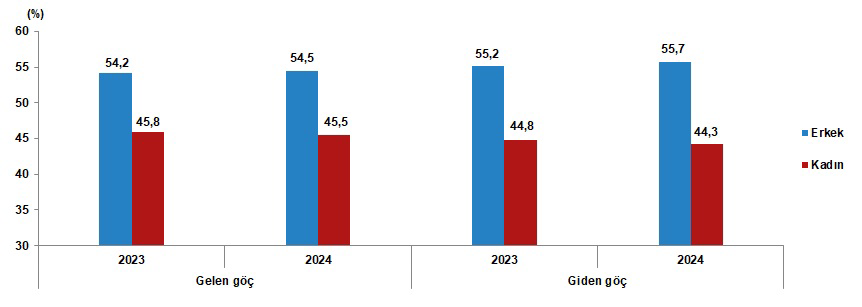 Buna göre, Türkiye'ye göç edenlerin sayısı 2024'te bir önceki yıla göre yüzde 0,6 azalarak 314 bin 588 kişi oldu. Bunların yüzde 54,5'ini erkekler, yüzde 45,5'ini ise kadınlar oluşturdu.