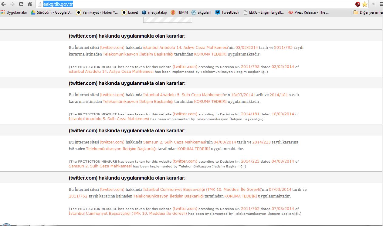 Telekomünikasyon İletişim Başkanlığı’nın (TİB) www.twitter.com sitesine erişimin engellenmesine ilişkin sıraladığı kararlar şöyle:
