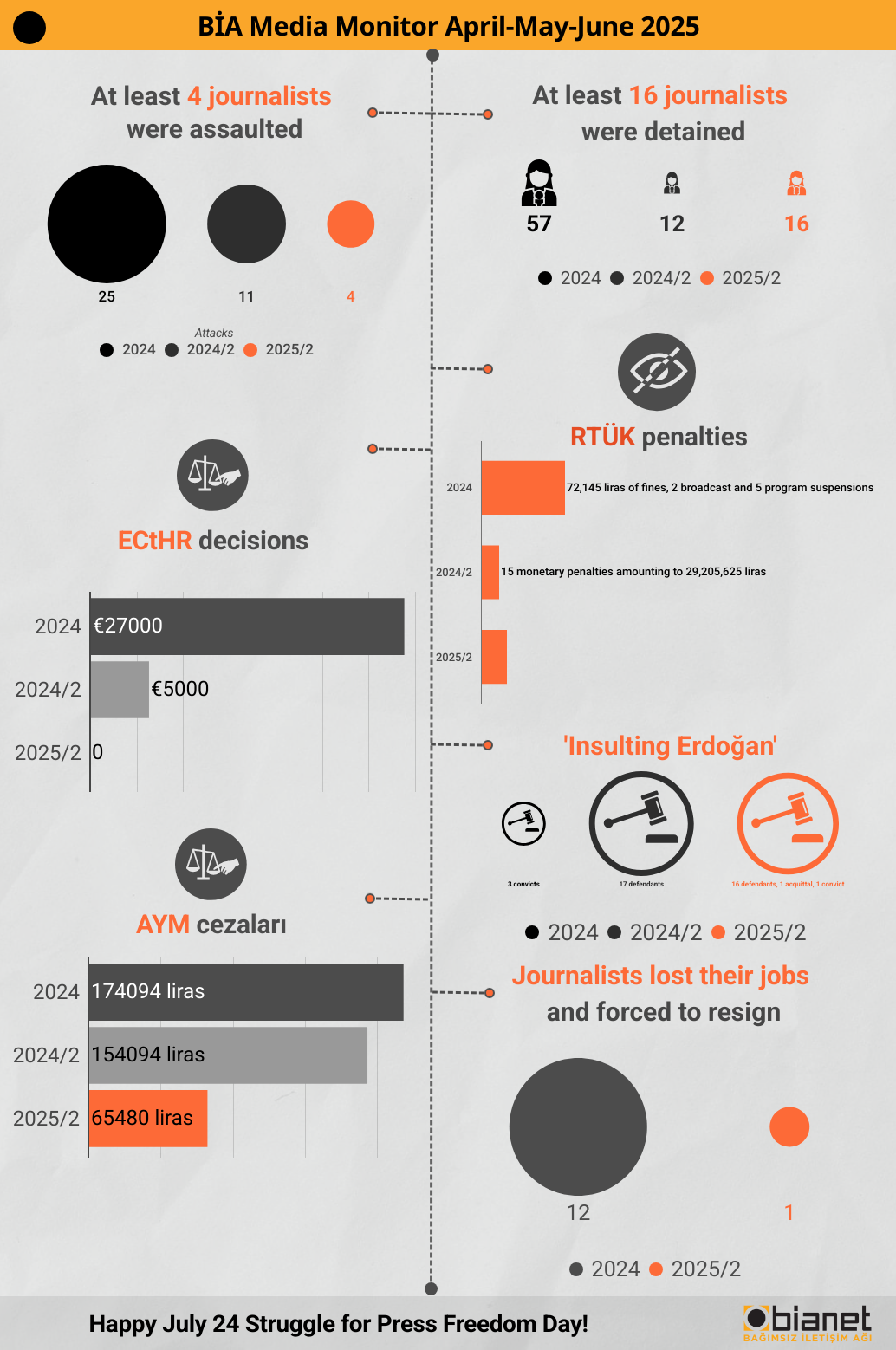 The BİA Media Monitoring Report covering the period of April - May - June 2025 shows that despite the government's heavy interference in the judiciary, and although some positive decisions that keep hope alive have emerged in local courts, at least 20 journalists, photojournalists, and illustrators were arrested in the last six months, at least three were placed under house arrest, and dozens were arbitrarily restricted through judicial control measures such as travel bans.