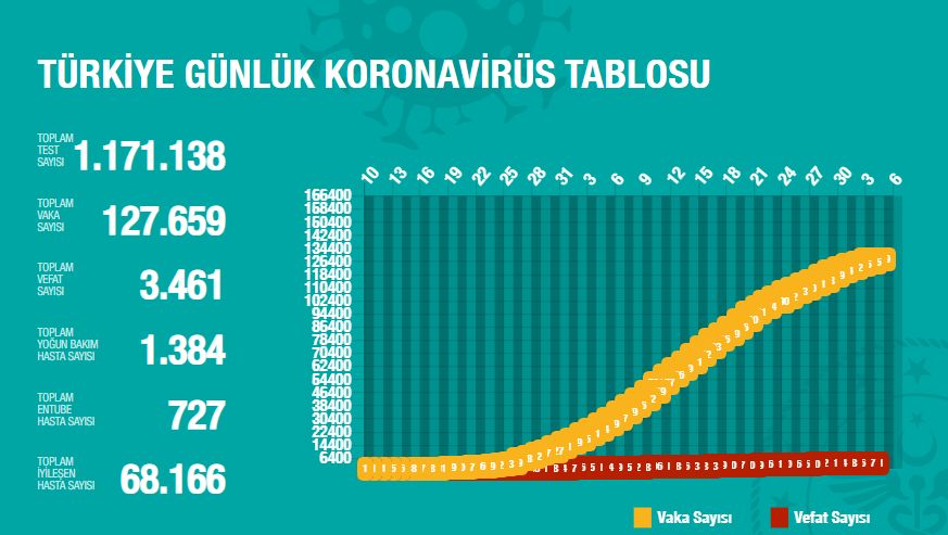 Türkiye’de açıklanan günlük vaka ve ölümler11 Mart: 1 vaka 13 Mart: 3 vaka 14 Mart: 6 vaka 15 Mart: 18 vaka 16 Mart: 29 vaka 17 Mart: 51 vaka, 1 ölüm 18 Mart: 93 vaka, 1 ölüm 19 Mart: 168 vaka, 2 ölüm (1.981 test) 20 Mart: 311 vaka, 5 ölüm (3.656 test) 21 Mart: 277 vaka, 12 ölüm (2.953 test) 22 Mart: 289 vaka, 9 ölüm 23 Mart: 293 vaka, 7 ölüm (3.672 test) 24 Mart: 343 vaka, 7 ölüm (3.952 test) 25 Mart: 561 vaka, 15 ölüm (5.035 test) 26 Mart: 1196 vaka, 16 ölüm (7.286 test) 27 Mart: 2069 vaka, 17 ölüm (7.533 test) 28 Mart: 1704 vaka, 16 ölüm (7.641 test) 29 Mart: 1815 vaka, 23 ölüm (9.982 test) 30 Mart: 1610 vaka, 37 ölüm (11.535 test) 31 Mart: 2704 vaka, 46 ölüm (15.422 test) 1 Nisan: 2148 vaka, 63 ölüm (14.396 test) 2 Nisan: 2456 vaka, 79 ölüm (18.757 test) 3 Nisan: 2786 vaka, 69 ölüm (16.160 test) 4 Nisan: 3012 vaka, 76 ölüm (19.664 test) 5 Nisan: 3015 vaka, 73 ölüm (20.065 test) 6 Nisan: 3148 vaka, 75 ölüm (21.400 test) 7 Nisan: 3892 vaka, 76 ölüm (20.023 test) 8 Nisan: 4117 vaka, 87 ölüm (24.900 test) 9 Nisan: 4056 vaka, 96 ölüm (28.578 test) 10 Nisan: 4747 vaka, 98 ölüm (30.864 test) 11 Nisan: 5138 vaka, 95 ölüm (33.170 test) 12 Nisan: 4789 vaka, 97 ölüm (35.720 test) 13 Nisan: 4093 vaka, 98 ölüm (34.456 test) 14 Nisan: 4062 vaka, 107 ölüm (33.070 test) 15 Nisan: 4281 vaka, 115 ölüm (34.090 test) 16 Nisan: 4801 vaka, 125 ölüm (40.427 test) 17 Nisan: 4353 vaka, 126 ölüm (40.270 test) 18 Nisan: 3783 vaka, 121 ölüm (40.520 test) 19 Nisan: 3977 vaka, 127 ölüm (35.344 test) 20 Nisan: 4674 vaka, 123 ölüm (39.703 test) 21 Nisan: 4611 vaka, 119 ölüm (39.429 test) 22 Nisan: 3083 vaka, 117 ölüm (37.535 test) 23 Nisan: 3116 vaka, 115 ölüm (40.962 test) 24 Nisan: 3122 vaka, 109 ölüm (38.351 test) 25 Nisan: 2861 vaka, 106 ölüm (38.308 test) 26 Nisan: 2357 vaka, 99 ölüm (30.177 test) 27 Nisan: 2131 vaka, 95 ölüm (20.143 test) 28 Nisan: 2392 vaka, 92 ölüm (29.230 test) 29 Nisan: 2936 vaka, 89 ölüm (43.498 test) 30 Nisan: 2615 vaka, 93 ölüm (42.004 test) 1 Mayıs: 2188 vaka, 84 ölüm (41.431 test) 2 Mayıs: 1983 vaka, 78 ölüm (36.318 test) 3 Mayıs: 1670 vaka, 61 ölüm (24.001 test) 4 Mayıs: 1614 vaka, 64 ölüm (35.771 test) |
