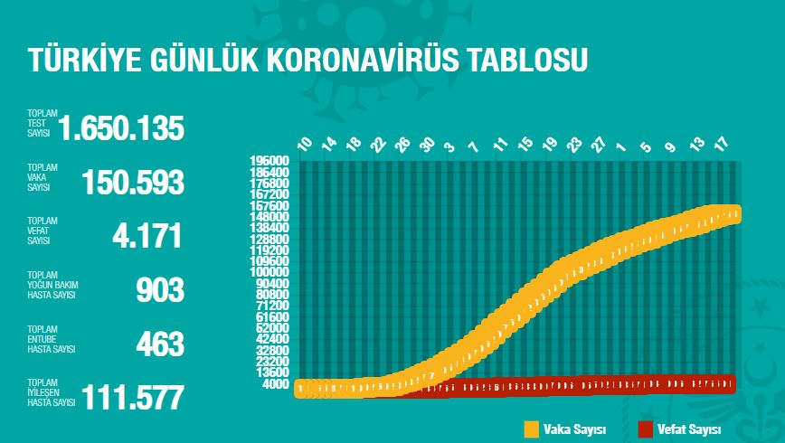 Türkiye’de açıklanan günlük vaka ve ölümler11 Mart: 1 vaka 13 Mart: 3 vaka 14 Mart: 6 vaka 15 Mart: 18 vaka 16 Mart: 29 vaka 17 Mart: 51 vaka, 1 ölüm 18 Mart: 93 vaka, 1 ölüm 19 Mart: 168 vaka, 2 ölüm (1.981 test) 20 Mart: 311 vaka, 5 ölüm (3.656 test) 21 Mart: 277 vaka, 12 ölüm (2.953 test) 22 Mart: 289 vaka, 9 ölüm 23 Mart: 293 vaka, 7 ölüm (3.672 test) 24 Mart: 343 vaka, 7 ölüm (3.952 test) 25 Mart: 561 vaka, 15 ölüm (5.035 test) 26 Mart: 1196 vaka, 16 ölüm (7.286 test) 27 Mart: 2069 vaka, 17 ölüm (7.533 test) 28 Mart: 1704 vaka, 16 ölüm (7.641 test) 29 Mart: 1815 vaka, 23 ölüm (9.982 test) 30 Mart: 1610 vaka, 37 ölüm (11.535 test) 31 Mart: 2704 vaka, 46 ölüm (15.422 test) 1 Nisan: 2148 vaka, 63 ölüm (14.396 test) 2 Nisan: 2456 vaka, 79 ölüm (18.757 test) 3 Nisan: 2786 vaka, 69 ölüm (16.160 test) 4 Nisan: 3012 vaka, 76 ölüm (19.664 test) 5 Nisan: 3015 vaka, 73 ölüm (20.065 test) 6 Nisan: 3148 vaka, 75 ölüm (21.400 test) 7 Nisan: 3892 vaka, 76 ölüm (20.023 test) 8 Nisan: 4117 vaka, 87 ölüm (24.900 test) 9 Nisan: 4056 vaka, 96 ölüm (28.578 test) 10 Nisan: 4747 vaka, 98 ölüm (30.864 test) 11 Nisan: 5138 vaka, 95 ölüm (33.170 test) 12 Nisan: 4789 vaka, 97 ölüm (35.720 test) 13 Nisan: 4093 vaka, 98 ölüm (34.456 test) 14 Nisan: 4062 vaka, 107 ölüm (33.070 test) 15 Nisan: 4281 vaka, 115 ölüm (34.090 test) 16 Nisan: 4801 vaka, 125 ölüm (40.427 test) 17 Nisan: 4353 vaka, 126 ölüm (40.270 test) 18 Nisan: 3783 vaka, 121 ölüm (40.520 test) 19 Nisan: 3977 vaka, 127 ölüm (35.344 test) 20 Nisan: 4674 vaka, 123 ölüm (39.703 test) 21 Nisan: 4611 vaka, 119 ölüm (39.429 test) 22 Nisan: 3083 vaka, 117 ölüm (37.535 test) 23 Nisan: 3116 vaka, 115 ölüm (40.962 test) 24 Nisan: 3122 vaka, 109 ölüm (38.351 test) 25 Nisan: 2861 vaka, 106 ölüm (38.308 test) 26 Nisan: 2357 vaka, 99 ölüm (30.177 test) 27 Nisan: 2131 vaka, 95 ölüm (20.143 test) 28 Nisan: 2392 vaka, 92 ölüm (29.230 test) 29 Nisan: 2936 vaka, 89 ölüm (43.498 test) 30 Nisan: 2615 vaka, 93 ölüm (42.004 test) 1 Mayıs: 2188 vaka, 84 ölüm (41.431 test) 2 Mayıs: 1983 vaka, 78 ölüm (36.318 test) 3 Mayıs: 1670 vaka, 61 ölüm (24.001 test) 4 Mayıs: 1614 vaka, 64 ölüm (35.771 test) 5 Mayıs: 1832 vaka, 59 ölüm (33.283 test) 6 Mayıs: 2253 vaka, 64 ölüm (30.303 test) 7 Mayıs: 1977 vaka, 57 ölüm (30.395 test) 8 Mayıs: 1848 vaka, 48 ölüm (33.687 test) 9 Mayıs: 1546 vaka, 50 ölüm (35. 605 test) 10 Mayıs: 1152 vaka, 47 ölüm (36.187 test) 11 Mayıs: 1114 vaka, 55 ölüm (32.722 test) 12 Mayıs: 1704 vaka, 53 ölüm (37.351 test) 13 Mayıs: 1639 vaka, 58 ölüm (33.332 test) 14 Mayıs: 1635 vaka, 55 ölüm (34.821 test) 15 Mayıs: 1708 vaka, 48 ölüm (38.565 test) 16 Mayıs: 1610 (vaka) 41 ölüm (42.236 test) 17 Mayıs: 1368 vaka, 44 ölüm (35.369 test) 18 Mayıs: 1158 vaka, 33 ölüm (25.141 test) |