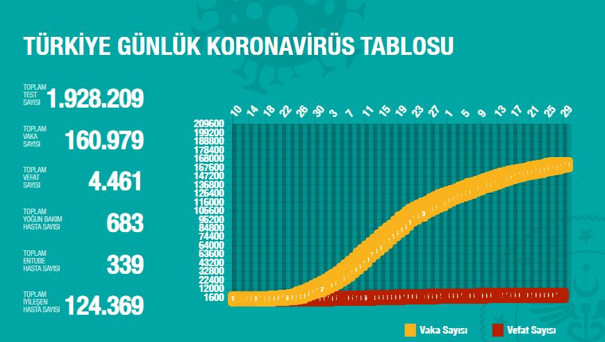 Türkiye’de açıklanan günlük vaka ve ölümler11 Mart: 1 vaka 13 Mart: 3 vaka 14 Mart: 6 vaka 15 Mart: 18 vaka 16 Mart: 29 vaka 17 Mart: 51 vaka, 1 ölüm 18 Mart: 93 vaka, 1 ölüm 19 Mart: 168 vaka, 2 ölüm (1.981 test) 20 Mart: 311 vaka, 5 ölüm (3.656 test) 21 Mart: 277 vaka, 12 ölüm (2.953 test) 22 Mart: 289 vaka, 9 ölüm 23 Mart: 293 vaka, 7 ölüm (3.672 test) 24 Mart: 343 vaka, 7 ölüm (3.952 test) 25 Mart: 561 vaka, 15 ölüm (5.035 test) 26 Mart: 1196 vaka, 16 ölüm (7.286 test) 27 Mart: 2069 vaka, 17 ölüm (7.533 test) 28 Mart: 1704 vaka, 16 ölüm (7.641 test) 29 Mart: 1815 vaka, 23 ölüm (9.982 test) 30 Mart: 1610 vaka, 37 ölüm (11.535 test) 31 Mart: 2704 vaka, 46 ölüm (15.422 test) 1 Nisan: 2148 vaka, 63 ölüm (14.396 test) 2 Nisan: 2456 vaka, 79 ölüm (18.757 test) 3 Nisan: 2786 vaka, 69 ölüm (16.160 test) 4 Nisan: 3012 vaka, 76 ölüm (19.664 test) 5 Nisan: 3015 vaka, 73 ölüm (20.065 test) 6 Nisan: 3148 vaka, 75 ölüm (21.400 test) 7 Nisan: 3892 vaka, 76 ölüm (20.023 test) 8 Nisan: 4117 vaka, 87 ölüm (24.900 test) 9 Nisan: 4056 vaka, 96 ölüm (28.578 test) 10 Nisan: 4747 vaka, 98 ölüm (30.864 test) 11 Nisan: 5138 vaka, 95 ölüm (33.170 test) 12 Nisan: 4789 vaka, 97 ölüm (35.720 test) 13 Nisan: 4093 vaka, 98 ölüm (34.456 test) 14 Nisan: 4062 vaka, 107 ölüm (33.070 test) 15 Nisan: 4281 vaka, 115 ölüm (34.090 test) 16 Nisan: 4801 vaka, 125 ölüm (40.427 test) 17 Nisan: 4353 vaka, 126 ölüm (40.270 test) 18 Nisan: 3783 vaka, 121 ölüm (40.520 test) 19 Nisan: 3977 vaka, 127 ölüm (35.344 test) 20 Nisan: 4674 vaka, 123 ölüm (39.703 test) 21 Nisan: 4611 vaka, 119 ölüm (39.429 test) 22 Nisan: 3083 vaka, 117 ölüm (37.535 test) 23 Nisan: 3116 vaka, 115 ölüm (40.962 test) 24 Nisan: 3122 vaka, 109 ölüm (38.351 test) 25 Nisan: 2861 vaka, 106 ölüm (38.308 test) 26 Nisan: 2357 vaka, 99 ölüm (30.177 test) 27 Nisan: 2131 vaka, 95 ölüm (20.143 test) 28 Nisan: 2392 vaka, 92 ölüm (29.230 test) 29 Nisan: 2936 vaka, 89 ölüm (43.498 test) 30 Nisan: 2615 vaka, 93 ölüm (42.004 test) 1 Mayıs: 2188 vaka, 84 ölüm (41.431 test) 2 Mayıs: 1983 vaka, 78 ölüm (36.318 test) 3 Mayıs: 1670 vaka, 61 ölüm (24.001 test) 4 Mayıs: 1614 vaka, 64 ölüm (35.771 test) 5 Mayıs: 1832 vaka, 59 ölüm (33.283 test) 6 Mayıs: 2253 vaka, 64 ölüm (30.303 test) 7 Mayıs: 1977 vaka, 57 ölüm (30.395 test) 8 Mayıs: 1848 vaka, 48 ölüm (33.687 test) 9 Mayıs: 1546 vaka, 50 ölüm (35. 605 test) 10 Mayıs: 1152 vaka, 47 ölüm (36.187 test) 11 Mayıs: 1114 vaka, 55 ölüm (32.722 test) 12 Mayıs: 1704 vaka, 53 ölüm (37.351 test) 13 Mayıs: 1639 vaka, 58 ölüm (33.332 test) 14 Mayıs: 1635 vaka, 55 ölüm (34.821 test) 15 Mayıs: 1708 vaka, 48 ölüm (38.565 test) 16 Mayıs: 1610 (vaka) 41 ölüm (42.236 test) 17 Mayıs: 1368 vaka, 44 ölüm (35.369 test) 18 Mayıs: 1158 vaka, 33 ölüm (25.141 test) 19 Mayıs: 1022 vaka, 28 ölüm (25.382 test) 20 Mayıs: 972 vaka, 22 ölüm (20.838 test) 21 Mayıs: 961 vaka, 27 ölüm (33.633 test) 22 Mayıs: 961 vaka, 27 ölüm (37.507 test) 23 Mayıs: 1186 vaka, 32 ölüm (40 .178 test) 24 Mayıs: 1141 vaka, 32 ölüm (24.589 test) 25 Mayıs: 987 vaka, 29 ölüm (21.492 test) 26 Mayıs: 948 vaka, 28 ölüm (19.853 test) 27 Mayıs: 1035 vaka, 34 ölüm (21.043 test) 28 Mayıs: 1182 vaka, 30 ölüm (33.559 test) |