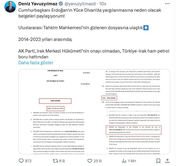 CHP Genel Başkan Yardımcısı ve Zonguldak Milletvekili Deniz Yavuzyılmaz, sosyal medya hesabından yaptığı açıklamada, Türkiye'nin, Irak Merkezi Hükümeti’nin izni olmadan petrol taşıdığını ve bu nedenle Uluslararası Tahkim Mahkemesi tarafından cezalandırıldığını öne sürdü.