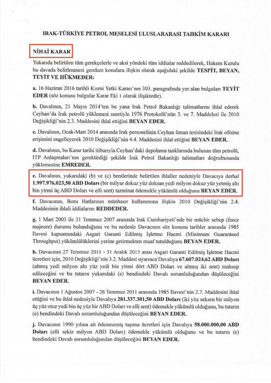 AK Parti, Irak Merkezi Hükümeti’nin onayı olmadan, Türkiye-Irak ham petrol boru hattından (Irak Bölgesel Kürt Yönetimi’yle anlaşarak) petrol taşıyıp, Ceyhan’da Irak petrolü yüklemesi yaptığı için, Tahkim’de Türkiye cezaya çarptırıldı.