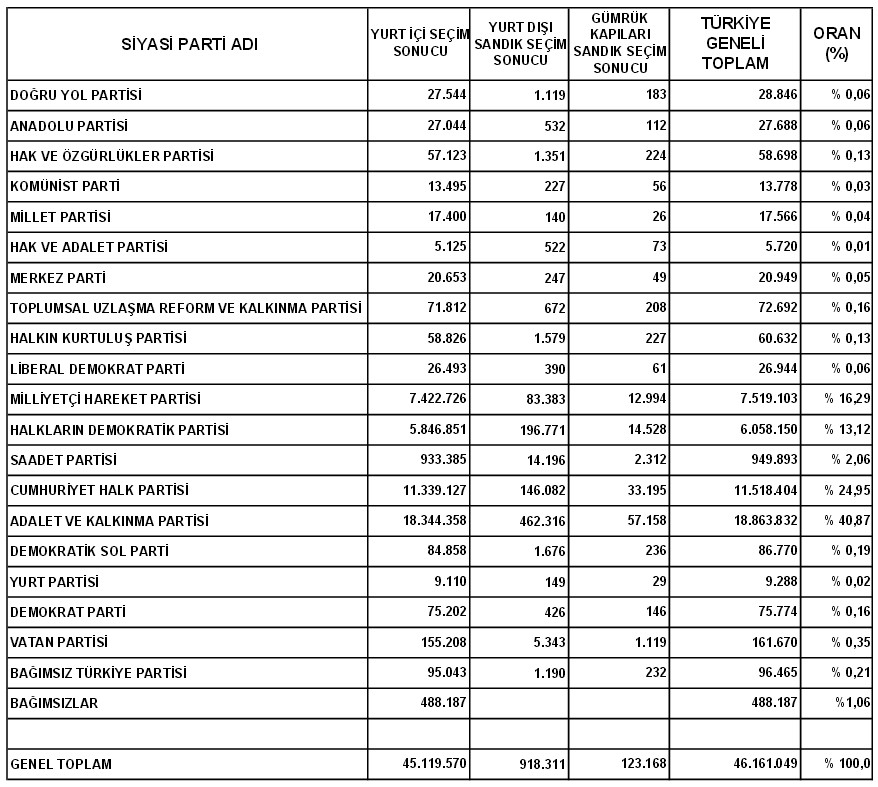Geçici sonuçlara göre; AKP 18 milyon 863 bin 832, CHP 11 milyon 518 bin 404, MHP 7 milyon 519 bin 103, HDP ise 6 milyon 58 bin 150 oy aldı.