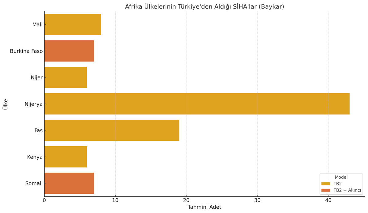 Türkiye merkezli Baykar Savunma tarafından üretilen Bayraktar TB2 ve Akıncı tipi silahlı insansız hava araçları (SİHA), Afrika’da giderek daha fazla ülkenin askeri envanterine giriyor. Uluslararası Stratejik Araştırmalar Enstitüsü (IISS) ve Yeni Amerikan Güvenliği Merkezi (CNAS) verilerine göre Türkiye, son beş yıl içinde Afrika’ya en fazla silahlı drone satan ülke konumuna yükseldi.