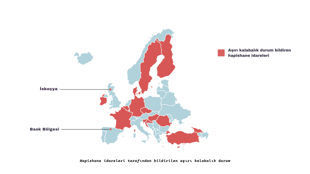 Kriz anlarında belirlenen geçici kapasite artışları zamanla “yeni normal” haline geliyor ve “kabul edilebilir doluluk” sınırı sürekli olarak yukarı çekiliyor. Bu durum aslında Türkiye hapishanelerinde insan hakları standartlarının sessizce yok edilmesi anlamına geliyor. Türkiye, raporda sunulan haritada kırmızı işaretli “aşırı kalabalık bildiren” ülkeler arasında yer alıyor.[7] Bu da, artırılmış operasyonel kapasite tanımlarına yani yapılan tüm kağıt üstü düzenlemelere rağmen sistem üzerindeki baskının idare tarafından kabul edildiğini gösteriyor.