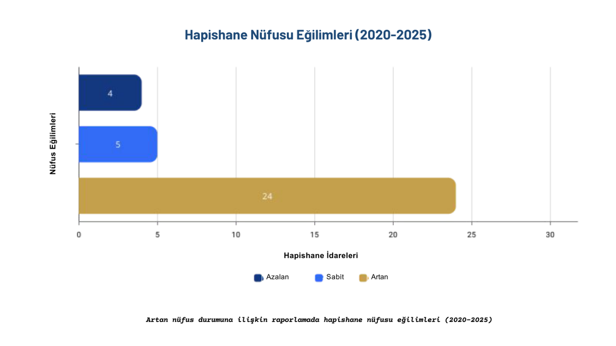 Fakat asıl alarm zilleri Türkiye için çalıyor. Rapor, Türkiye verilerine endişe verici ayrı bir parantez açıyor. Türkiye’de 2015 ile 2025 yılları arasında hapishane nüfusunun yüzde 51,9 oranında arttığı belirtiliyor.[5] Türkiye’nin Avrupa Konseyi ülkeleri arasında hapishane nüfusu bakımından ilk sırada olduğunu düşündüğümüzde bu artış artık istatistiksel bir eğilim değil; başlı başına farklı bir cezalandırma biçimine dönüşmüş bir gerçeklik ve çok katmanlı bir insan hakları ihlali olarak karşımızda duruyor.