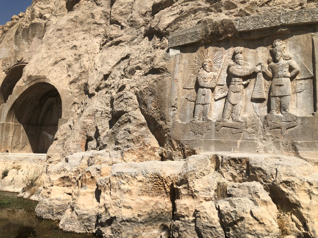 Kirmanşah’ta, Sasaniler döneminden (M.S. 379–383) kalma Taq-i Bostan’da üç görkemli mağarada kabartmalar var. Bence en anlamlısı: II. Ardaşir tam ortada, Ahura Mazda en sağda ve Zerdüşt’ün güneş tanrısı Mitra en solda ve ayakların altında ise Romalı İmparator Julius olduğu mağara kabartmları.