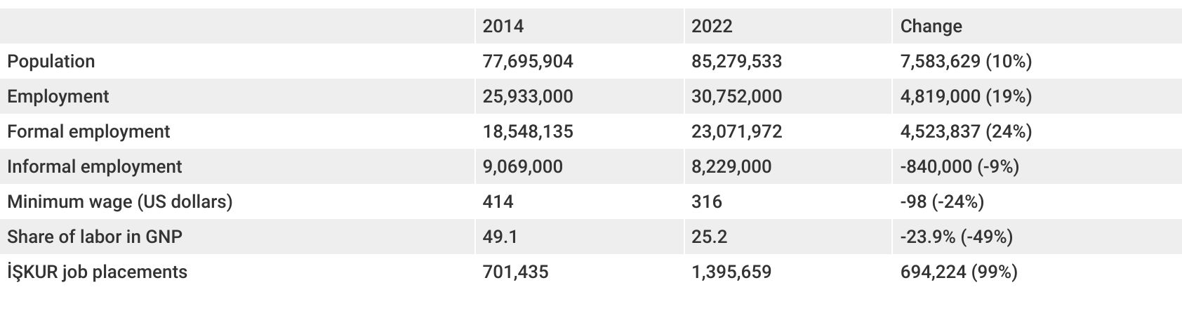 The table above demonstrates how the AKP government has successfully implemented a neoliberal policy of impoverishment that is detrimental to labor. The final line of the table shows the number of job placements by İŞKUR. Accordingly, İŞKUR, which placed 700,000 people in jobs in 2014, appears to have almost doubled this figure by 2022. It is also known that in some years, this figure has exceeded 100%. Between 2014 and 2022, the number of individuals placed in jobs by İŞKUR exceeded the total population growth, employment growth, and the increase in "insured employment" in Turkey.