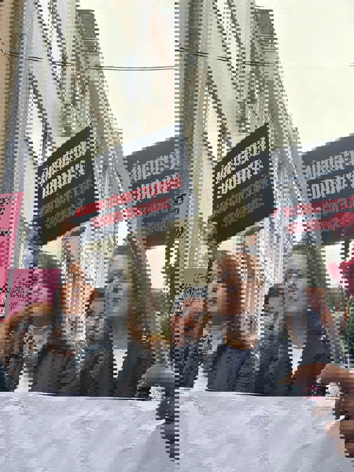 “Bir failin bir kadını öldürüp yurt dışına kaçma cesaretini bulmasını sağlayan bu sistemden sorulacak hesabımız var. Cezasızlık cesaretlendirir onları. Şiddetin beslendiği bir düzende mümkündür yurt dışına kaçabileceğine inanmak. Bu yüzden bir kez daha haykırıyoruz: Kadın cinayetleri politiktir.”