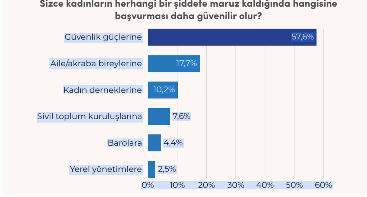 Barometrenin nicel verileri kadınların şiddete uğradıklarında en güvenilir kurum olarak güvenlik güçlerini gördüklerini belirtmekle beraber (%60), derinlemesine görüşmelerde bununla çelişen anlatılarla karşılaşılıyor.