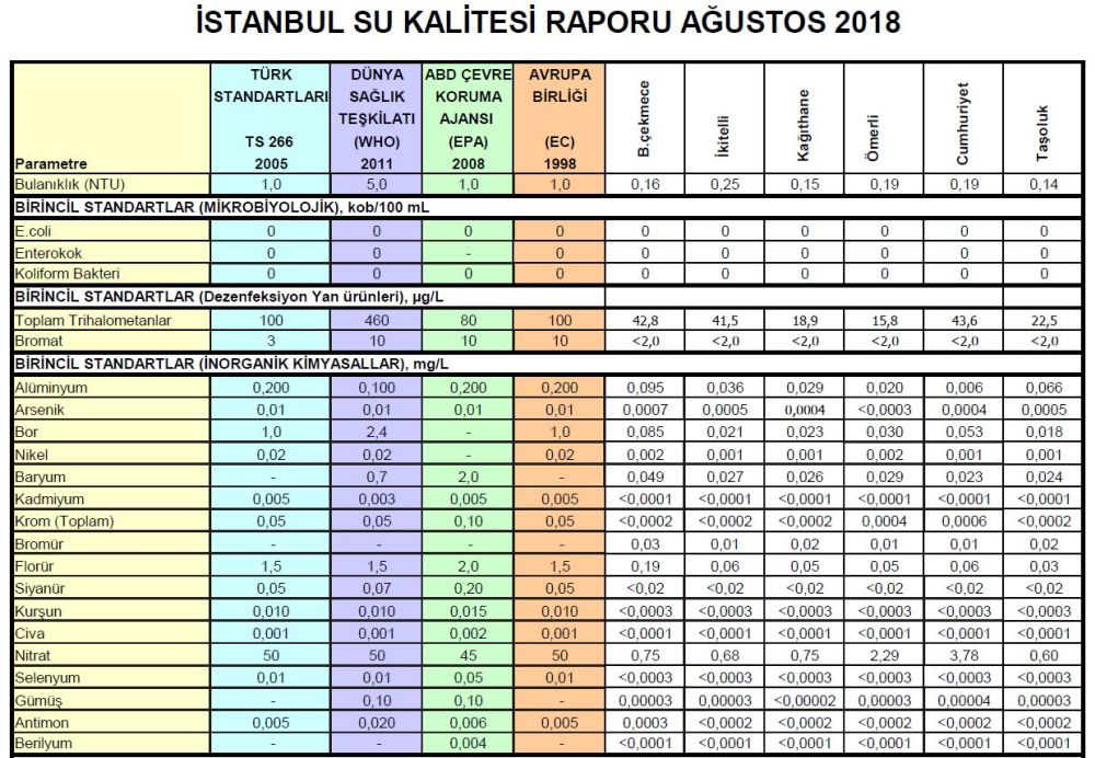 Raporun sadece bir kısmını aldım; tamamı linkini açıp, Ağustos 2018 tarihli rapor seçilerek görüntülenebilir. Sitede yer alan raporlar incelediğinde İstanbul sularında bir kimyasal kirlilik sorunu olmadığı; kimyasal kirlilik parametreleri açısından Türk Standartları Enstitüsü’nün su standardına ya da uluslararası kurumların sularla ilgili kirlilik yönetmeliklerine aykırı bir durum olmadığı görülecek.