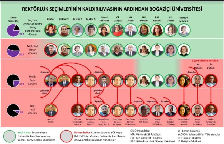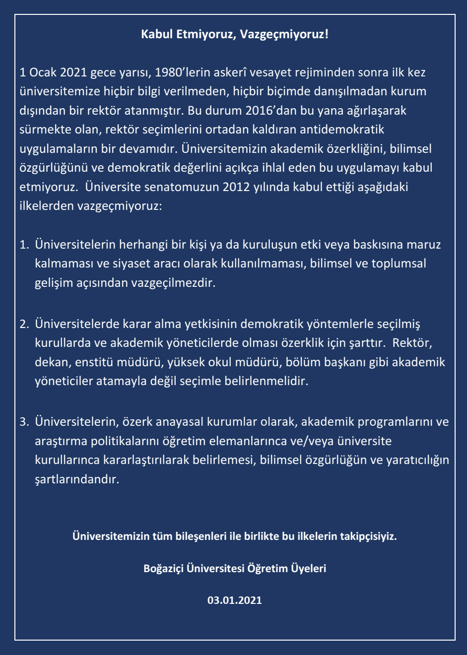 31 Aralık 2020’yi 1 Ocak 2021’ye bağlayan gece yarısı “cumhurbaşkanı hükmünde kararname” adını koyabileceğimiz tek satırlık ve tek imzalı bir tebliğ ile 160 yılı aşkın bir geleneğinin son 50 yılını kamu üniversitesi olarak taşımış, ülkenin gençlerinin girmeyi en çok hayal ettiği üniversitelerden birine kurumun mensuplarınca adı sanı bilinmez bir kişi atandı. Bu kabul edilemez ve üniversitemizin 2012 Senato ilkeleriyle 180 derece tezat içindeki atamaya karşı, öğretim üyeleri olarak, 3 Ocak 2021 tarihinde söz konusu senato ilkelerinden alınmış üç kritik maddeyi vurgulayarak kamuoyuna bu atamayı kabul etmediğimizi ve buna karşı mücadeleden vazgeçmeyeceğimizi açıkladık.