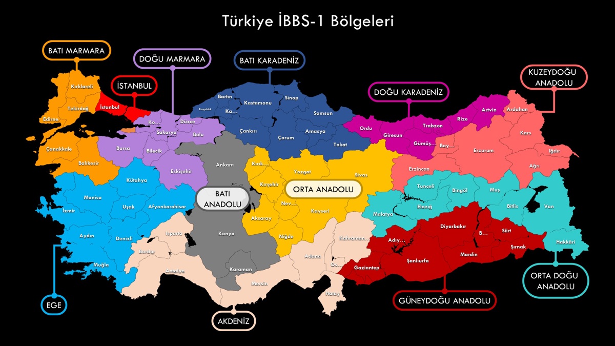 Örneğin, Düzey 1’de 12 bölgeden bir tanesi tek başına “İstanbul”; Bingöl, Bitlis, Elâzığ, Hakkâri, Malatya, Muş, Van ve Tunceli’den oluşan toplam sekiz il “Ortadoğu Anadolu”; Adıyaman, Batman, Diyarbakır, Gaziantep, Kilis, Mardin, Siirt, Şanlıurfa ve Şırnak’tan oluşan toplam dokuz il “Güneydoğu Anadolu”; Afyonkarahisar, Aydın, Denizli, İzmir, Kütahya, Manisa, Muğla ve Uşak’tan oluşan sekiz il de “Ege” bölgesi olarak tanımlandı. Günümüzde başta TÜİK, araştırmaları için TÜİK’in verilerini kullanan araştırmacılar ve akademi çevresi olmak üzere yaygın olarak İBBS kullanılıyor.